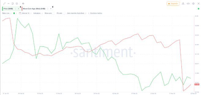 在下面的 Santiment 图表中,SHIB 平均币龄 (90d) 从 2 月 2 日的 44.63 下降到 3 月 22 日的 29.06。