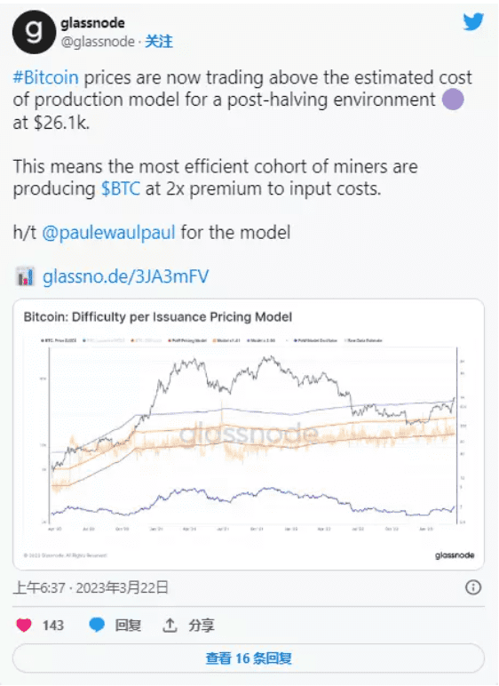 根据 Glassnode 的数据,在 BTC 突破 2.61 万美元的门槛后,高效的矿工群体在他们的采矿设备上获得了 2 倍的溢价。BTC 价格的飙升为矿工创造了积极的环境,许多人赚取了更多收入。