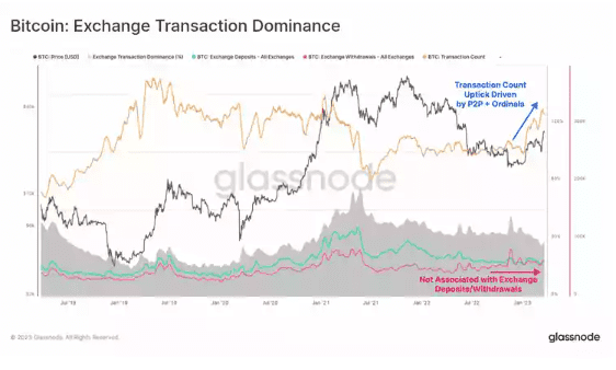矿工开始看到利润的另一个原因是网络活动增加。由于交换转账相对较低,可以推断出这种活动的大部分是由于点对点交易以及通过序数和铭文的引入。