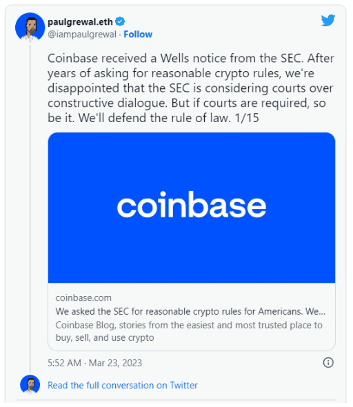 该公告对在纳斯达克上市的 Coinbase 股票产生了重大影响,该股票在 3 月 23 日下跌了 14%。