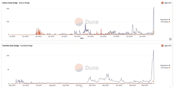 根据 gm365 在Dune Analytics上所编制的数据,过去几天桥接至zkSync及 StarkNet 等两大代表性 ZK Rollup 的资金量均出现了激增。此外,zkSync Lite 上的主要交易平台 ZigZag 也表示其单日交易量一度增长至近 10 万笔,链上活动明显增多。