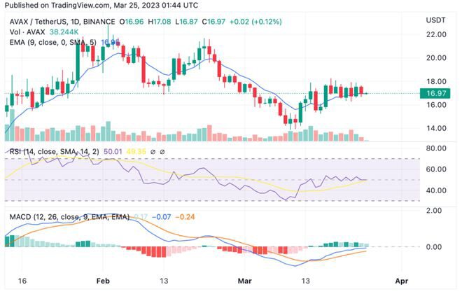 在 Avalanche 价格分析的 24 小时烛台图上,可以看到价格在 17 美元关口附近形成横向趋势,表明市场估值较低。交易者将等待明确的趋势模式出现后再采取行动,而价格目前仍略高于 9 天和 21 天移动平均线,以及关键的 50 天指数移动平均线 (EMA) 16.97 美元。