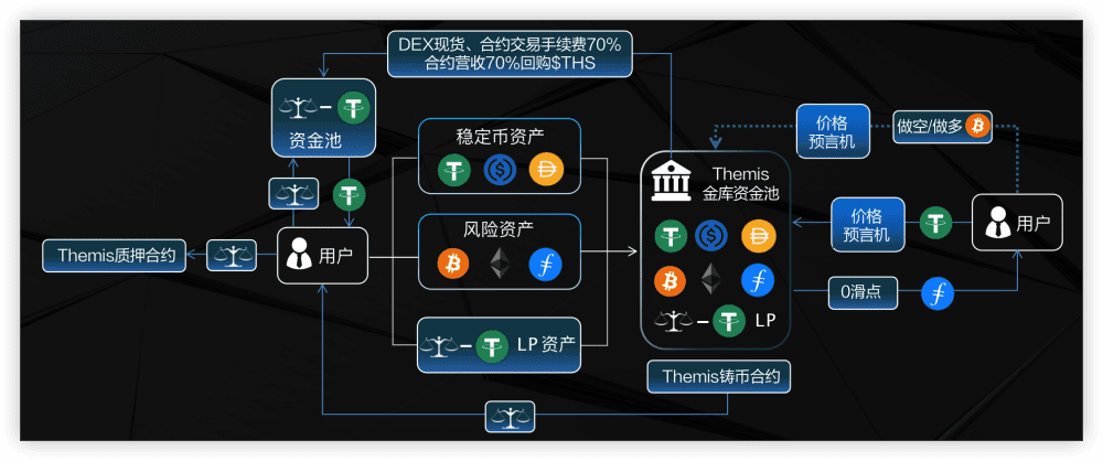 有别于传统的DEX和CEX,Themis Pro不采用AMM和订单簿的机制,而采用Themis金库资金池,金库资金池由一篮子的蓝筹加密货币组成,池子里有BTC/ETH/FIL/USDT等主流加密资产及稳定币,来满足用户现货交易和合约交易的需求。金库资金池中风险资产(价格波动的资产)和稳定币资产的占比为50/50,上下5%左右浮动。