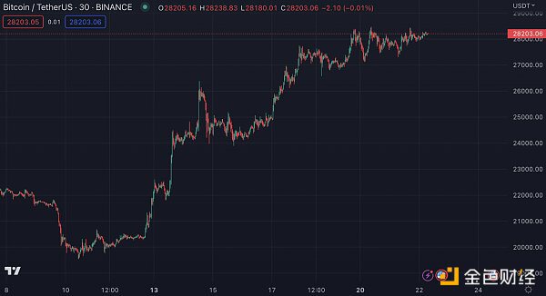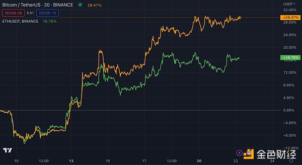自银行业危机爆发以来,加密货币市场已经走高。自 3 月 9 日以来,BTC 飙升 29.4% ,ETH 飙升 16.4% ,加密市场在此期间增加了 2630 亿美元的价值。
