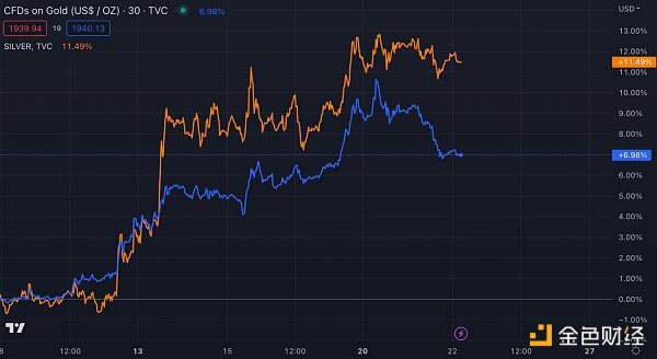 自银行业危机爆发以来,贵金属一直在飙升。自 3 月 9 日以来,黄金上涨了 11.5% ,而白银在此期间也上涨了 7.0% 。