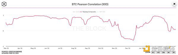 简单来看这种比较从来没有多大意义。尽管比特币和纳斯达克指数都与技术有关,但比特币是一种货币资产,它不是一家公司,也不产生现金流。尽管如此,在 SVB 之前,它们的相关性尚未显着减弱。