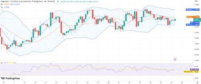 价格在波动率指标的上限和均线之间波动,表明波动性显着。这暗示了一个总体上令人鼓舞的未来迹象。根据布林带,DOGE 的最大支撑位在 0.066 美元,而代表阻力位的上限位在 0.079 美元。相对强度指数 (RSI) 在指数 49 处上升,曲线描绘了市场购买行为。当价格在 0.074 美元的水平上越过移动平均线 (MA) 时,这是一个看涨交叉。