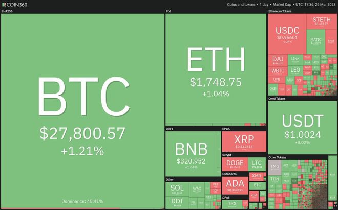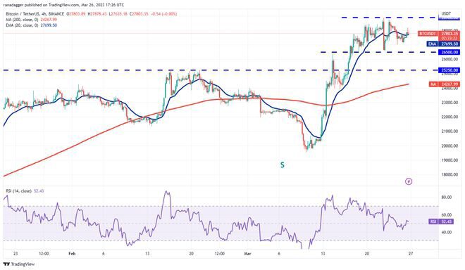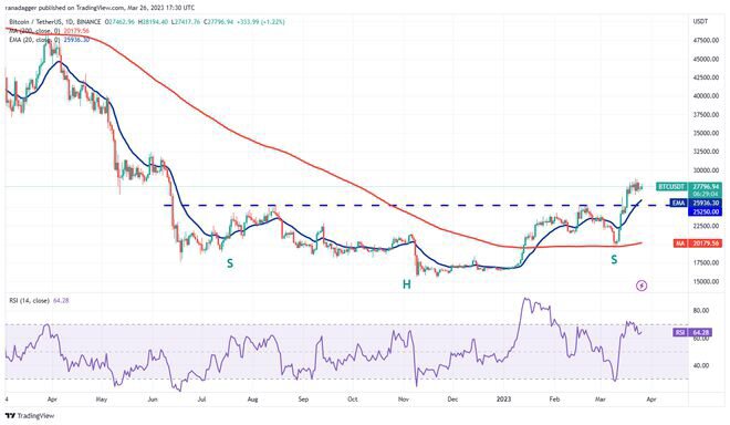 上升的 20 天指数移动平均线(25,936 美元)和正区域的相对强弱指数(RSI)表明多头仍处于控制之中。这增强了突破 28,900 美元的前景。