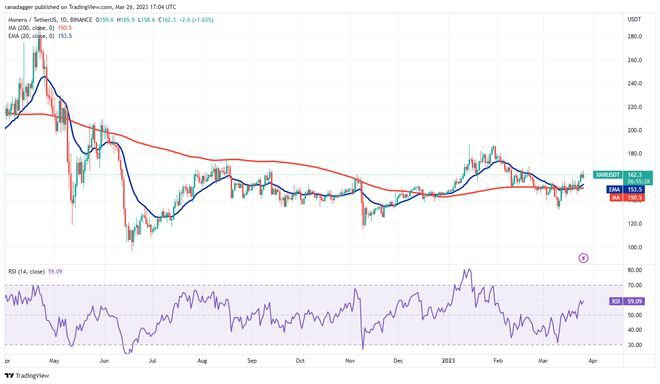20 日均线(153 美元)开始上扬,RSI 处于正值区域,表明买家有优势。在 170 美元处有一个小阻力,但如果多头克服这一障碍,XMR/USDT 货币对可能会获得动力并飙升至 187 美元,随后飙升至 210 美元。