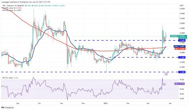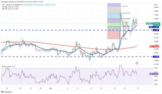 4 小时图显示空头正试图捍卫 61.8% 的斐波那契回撤位 0.46 美元,多头正在逢低买入至 20-EMA。这显示了多头和空头之间的平衡状态。