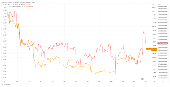 图表显示美联储的净流动性与比特币价格之间的相关性(来源:TradingView)