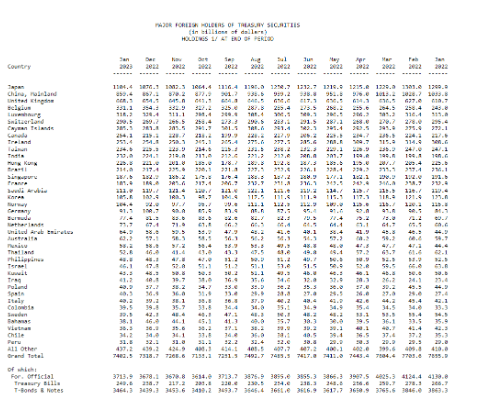 图表显示 2022 年 1 月至 2023 年 1 月美国国债的主要外国持有者及其余额(来源:美联储)