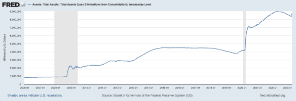 显示美联储在 2006 年至 2023 年间持有的总资产的图表(来源:美联储)