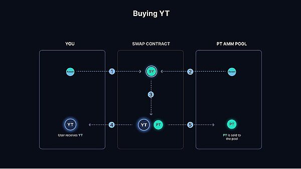 Pendle AMM 的核心在于 SY = PT + YT,通过上述恒定式可以看出,PT 与 YT 具有反向关系,可以利用这种价格的反向关系使用一个 PT-SY 交易对同时实现 PT 与 YT 的交易。以购买 YT 为例,当用户想要购买 YT 时,用户首先需要将 SY 发送到交易合约,随后,合约会从池中借出更多的 SY。用户的 SY 与合约取出的 SY 将一起被 Mint 成 PY 与 YT。紧接着,YT 将被发送给用户,实现用户对 YT 的购买,剩余的 PT 将被出售以返还借出 SY 的金额。