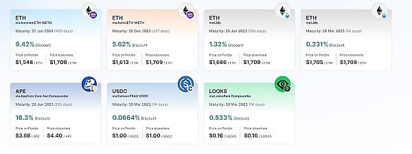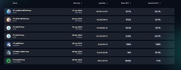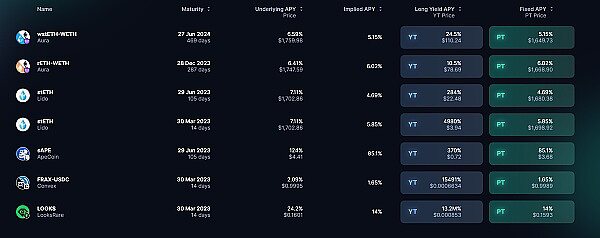 (1)PT:由于实现了息票剥离,因此,用户可以以更低的折现价格购买 PT 对应的标的资产。由下图可见,在以太坊主网上,用户可以以最高 16.3% 的折扣购买 APE,不过需要有 105 天的锁定期,直到 PT 到期才可赎回。若是用户对代币的长期价格具有信心,或是想要拥有相对稳定收益的小白用户,可以通过购买 PT 实现折价购买标的资产的策略。