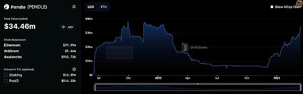 Pendle Finance 诞生于 2021 年,彼时乘着牛市的浪潮,Pendle Finance 的 TVL 一度逼近 4000 万美元。但随着熊市的到来以及加密货币场内资金以及用户的流失,Pendle Finance 的 TVL也一直萎靡不振,持续在 500 万美元左右徘徊。而近期,Pendle 的 TVL 开始随着 LSD 板块的爆发而迅速增长,几乎完全收复了 2022 年熊市的 TVL 流失,目前的 TVL 已经达到了 3400 万美元,突破历史高点指日可待。