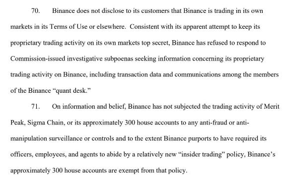 诉书称,CZ在 2017 年创立了币安,通过直接或间接拥有约 300 个“内部账户”在自己的平台上进行交易,但该交易所并未在其公开使用条款或其他地方披露这一活动。CFTC 表示,这些内部账户不受币安“内幕交易”政策的约束。