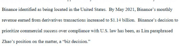 该监管机构表示:“Binance 的合规计划一直无效,在 Zhao 的指导下,Binance 已指示其员工和客户规避合规控制,以实现企业利润最大化,”