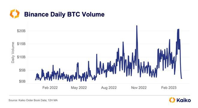 周末期间,币安的比特币 (BTC) 日交易量跌至 2022 年 7 月 4 日以来的最低水平。币安的交易量上一次跌至如此低点是在推出零费用交易计划前两天。
