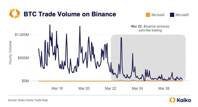 加密数据提供商 Kaiko 于 3 月 27 日透露,在结束除 TrueUSD (TUSD) 以外的所有交易对的零费用比特币交易后,BTC-USDT 对的比特币交易量在加密交易所 Binance 上下降了 90%。虽然 BTC-TUSD 货币对的每日交易量已增至 1.7 亿美元,但仍相对较低。