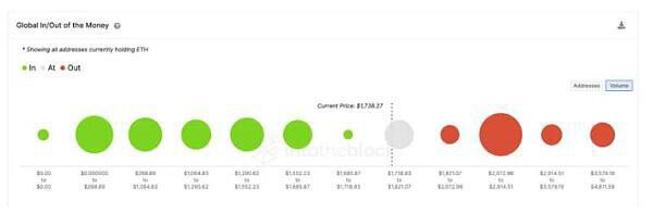 根据 IntoTheBlock 的全球资金进/出 (GIOM) 数据,以太坊预计很快将超过 2,500 美元。如下图所示,如果 ETH 价格能够突破其目前在 1,800 美元附近设定的阻力位,它将面临最小阻力,直到接近 1,900 美元。