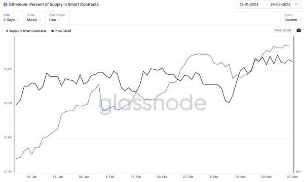 自 3 月 13 日以来,以太坊在 DeFi 智能合约中的供应量持续增加。从那时起,智能合约的供应量增加了近 500,000 ETH(占流通中的 ETH 总供应量的 0.4%)。截至 3 月 27 日,这些代币价值约 8.32 亿美元。