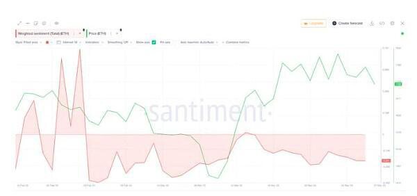 加权情绪比较资产的负面提及与正面提及的比率。低值意味着围绕以太坊的社会情绪在很大程度上是负面的。加密货币投资者可能认为这是进入市场的最佳时机。