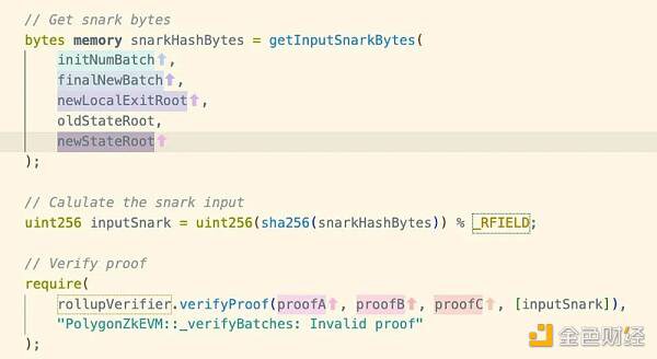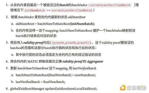 Aggregator 会将这个有效性证明(Validity Proof)以及对应的这些 Batch 执行后的状态一起提交到 L1 的Polygon zkEvm.sol 合约内,通过调用以下方法: