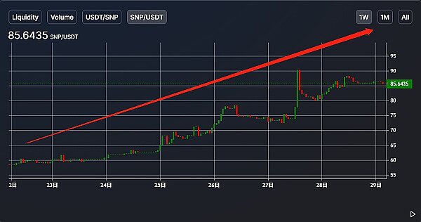 据Uniswap官方行情数据显示,截止3月29日,SNP价格已从3月22日的58.54 USDT涨至如今的85.64 USDT,一周内累计涨幅高达46.29%。