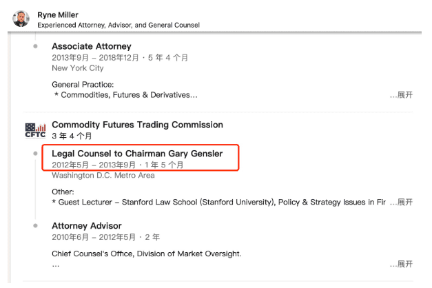 而在与币安“分道扬镳”后的这一年,SBF与CFTC的官员建立起千丝万缕的联系,扩大自身的政治影响力。2021年8月,FTX聘请前CFTC主席Ryne Miller为该交易所总法律顾问,后者曾在2012年到2013年期间担任Gary的法律顾问。任职期间,Ryne Miller还曾帮助安排SBF与前CFTC专员Dan Berkovitz、Mark Wetjen等人会面并共进晚餐,其中Dan Berkovitz为SEC总法律顾问。