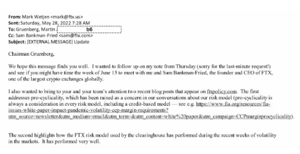 值得一提的是,借助Mark Wetjen的关系,美国联邦存款保险公司(FDIC)主席Martin J. Gruenberg还于2022年6月会见了SBF,这距离FTX申请破产仅相隔5个月。据《华盛顿观察报》分享的几封电子邮件显示,SBF曾试图通过Gruenberg说服FDIC接受对加密友好的监管规定,并在向后者发送的邮件中声称,“我们向CFTC提交了一份申请,为CFTC规划了如何做到它。CFTC所要做的就是批准它。一旦CFTC这样做了,其它交易所也将效仿,美国其它主要交易所也可拥有CFTC的牌照。”不仅如此,Mark Wetjen还曾邀请现任CFTC主席Rostin Behnam及旗下参谋长David Gillers召开讨论FXT旗下衍生品平台LedgerX的紧急会议,Behnam本人也承认与SBF曾多次会面。