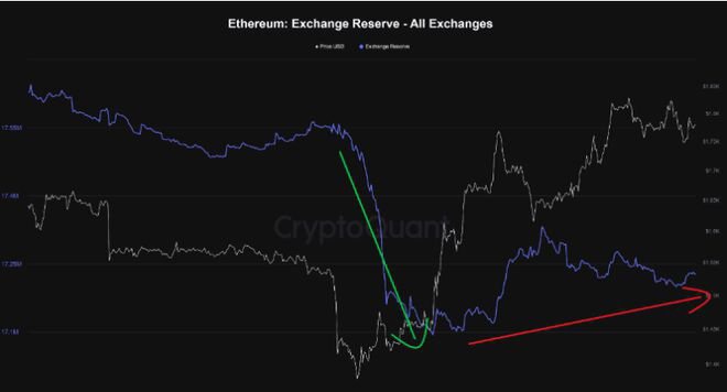 CryptoQuant分析师指出,投资者一直在将比特币存入交易所,但在本月早些时候跌破 20,000 美元时有所下降,这表明在低点附近出现了一些新的买盘。与比特币非常相似,以太坊交易所储备在局部低点附近暴跌,但在最近的反弹期间也呈上升趋势。