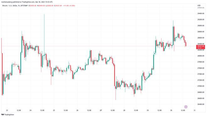 根据Cointelegraph Markets Pro和TradingView的数据,截至 3 月 30 日撰写本文时,BTC/USD 的交易价格约为 28,300 美元。