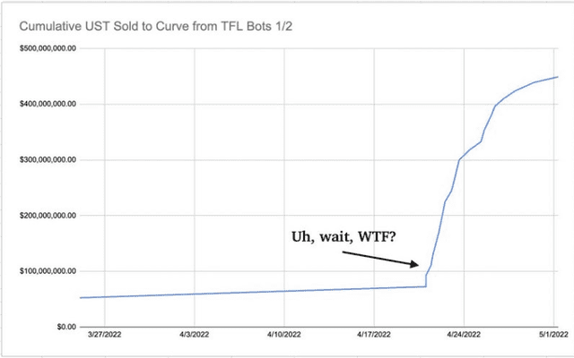5 月 UST 贬值的根本原因:在脱钩前的 3 周内,一个实体在公开市场上抛售了超过 4.5 亿美元的 UST。在他们最后一次出售的 4 天后,UST 开始崩溃。那个实体?不是别人,正是 Terraform Labs(TFL)。