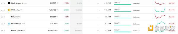 另据 nomics 数据显示,截至发稿时,GRAIL 过去 24 小时在 Arbitrum 网络的交易量达到 1028 万美元,位列该榜单的第 5 名。排除 USDT 等稳定币后,GRAIL 在 Arbitrum 网络的交易量也仅次于已上线 Binance 的 GMX 和 MAGIC。