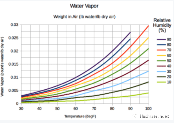 矿机要求进入的空气相对湿度要小于90%,以防止冷凝损坏。蒸发式冷却会增加进气的相对湿度,因此在使用时,密切监测空气湿度水平尤为重要。即使是炎热和干燥的地方,在雨季和降温期间也应该适当减少蒸发冷却的使用。