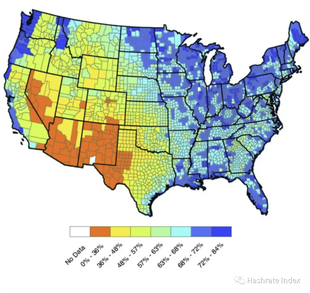由于冷却是通过蒸发水份来去除空气中的热量,所以蒸发冷却的效果在很大程度上取决于空气的湿度和温度。又热又干燥的空气最合适蒸发冷却,因此,冷却效果最好。然而蒸发冷却对海洋气候和高湿度的阴雨天气来说几乎是无效的。下图为美国地图,位于图中橙色和黄色区域的挖矿设施从蒸发式冷却中受益为最多。