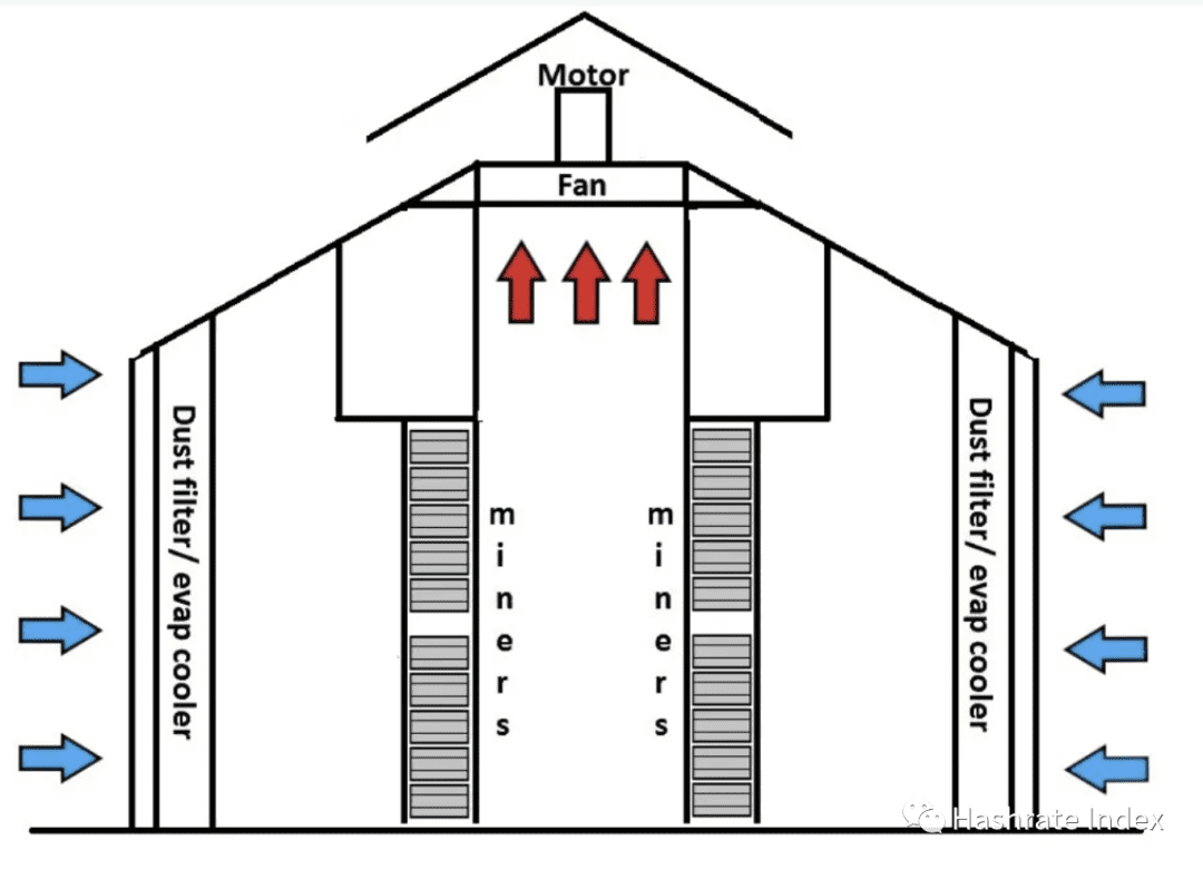 屋顶通风式设计正在逐步普及,现在通常在较大的挖矿设施(>5兆瓦)中可以看到。热空气自然上升,并通过安装在屋顶的排风扇排出建筑物外。这种类型的设计通过允许两侧进气,支持建筑物内更高的矿机部署密度。然而,屋顶通风的建筑物设计通常在建造和维护方面需要更多资金。