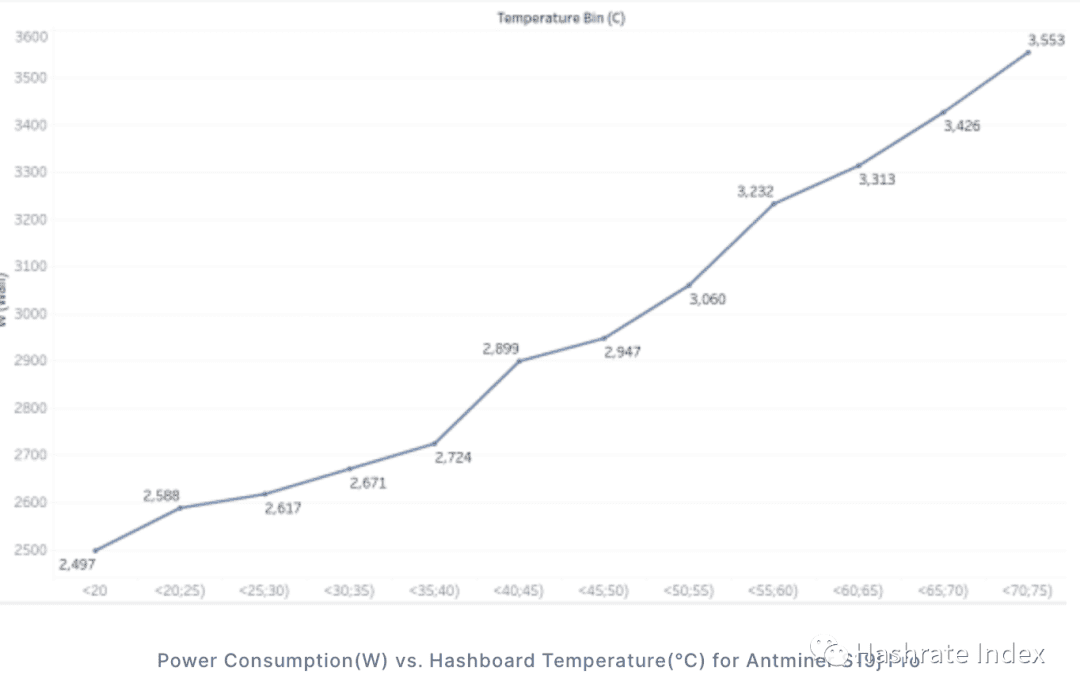 图二:矿机挖矿效率和算力板温度变化之间的关系 (以S19j Pro为例)