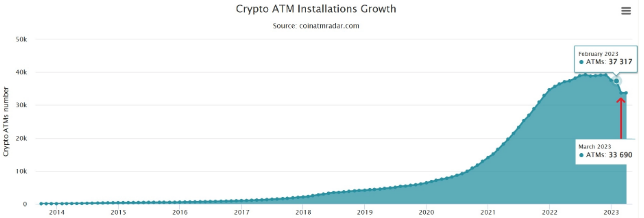 与不断增长的全球比特币相矛盾,专用于法定加密货币转换的物理 ATM 机正在下降。仅在 3 月份,就有 3,627 台加密货币 ATM 从网络中移除,使 ATM 总数减少到 33,727 台。