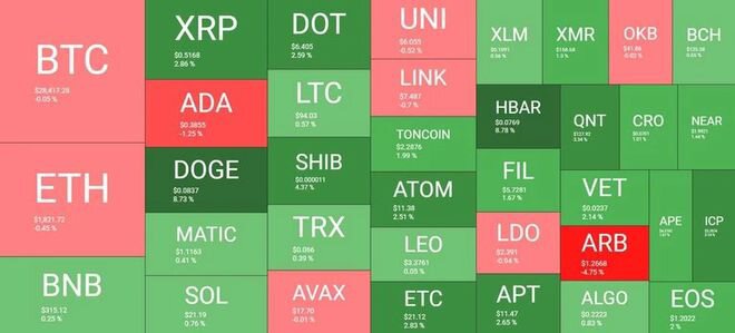 过去 24 小时基本平静,BTC 在 28,400 美元至 28,600 美元之间窄幅波动。自然,这意味着其市值一直保持相对稳定,略低于 5500 亿美元。它对山寨币的主导地位也与昨天基本持平——46.3%。