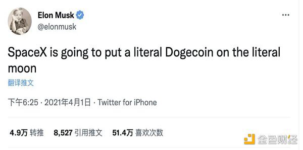 2021年4月1日愚人节,马斯克表示,要用SpaceX把一枚狗狗币带到月球上。