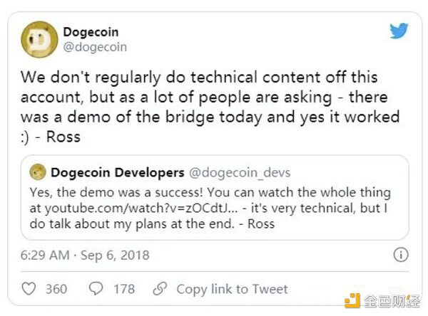这个网桥被认为是一个新的更新,将允许两个区块链之间的互操作性。该公告重新激起了社区对该项目的支持,并且狗狗币的价格在48小时内上涨了173%。然而,后来得知,由于以太坊的价格暴跌,没有足够的资金继续开发这座桥,所以更新被搁置。从那以后,没有人提及狗狗币和以太坊之间的桥梁是否会继续下去。狗狗币价格也复原了。