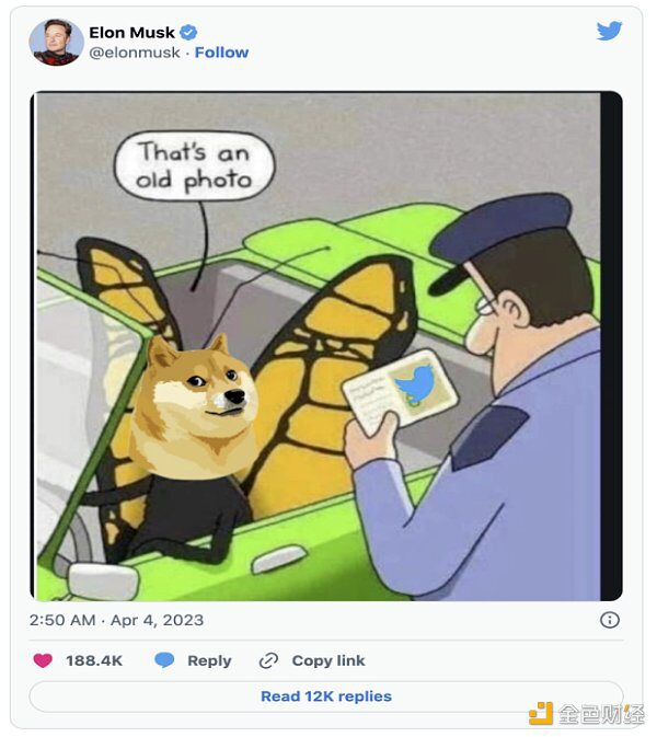 4月4日最新消息,推特网页Logo从蓝鸟变更为狗狗币表情头像。随后马斯克推特发布含有狗狗币表情的照片。