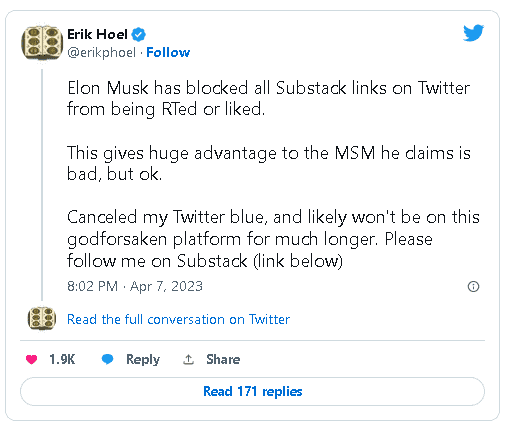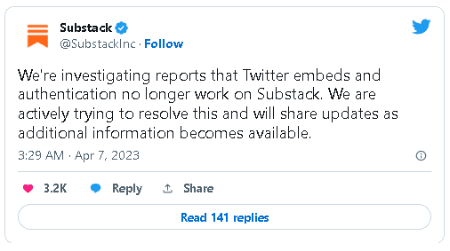 4 月 7 日,移动和网络上的 Twitter 用户发现自己无法与包含 Substack 页面链接的推文进行交互。