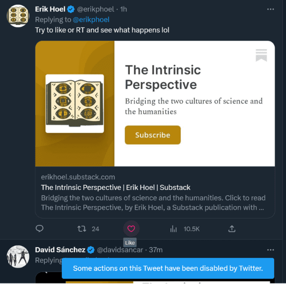 当许多用户尝试点赞、转发或回复包含 Substack 链接的帖子时,他们会收到一条错误消息,指出“Twitter 已禁用对此推文的某些操作”。在某些情况下,用户报告 UI 似乎记录了他们的喜欢或转发,但经检查,它似乎没有计算或显示交互。