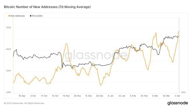 此外,加入比特币网络的新地址显着增加。看一眼 Glassnode 上的新地址指标,就证实了这种上升趋势。截至撰写本文时,新地址已超过 491,000 个,创下七个多月以来的最高数字。