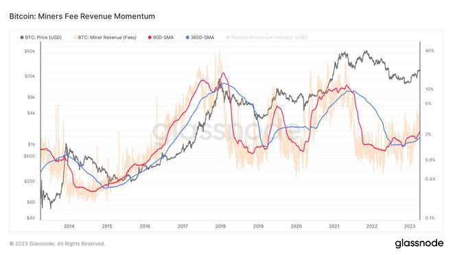 Glassnode 的数据揭示了矿工费用收入的势头及其与飙升市场的相关性。该指标显示 90 天简单移动平均线 (SMA) 已超过年度 SMA。