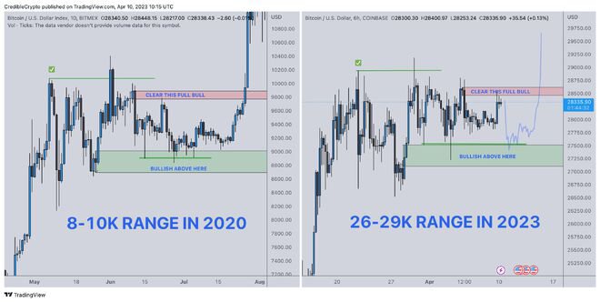 他认为,就价格行为而言,今天 26,000 美元至 29,000 美元与当年夏天的 8,000 美元至 10,000 美元区间“极其相似”。