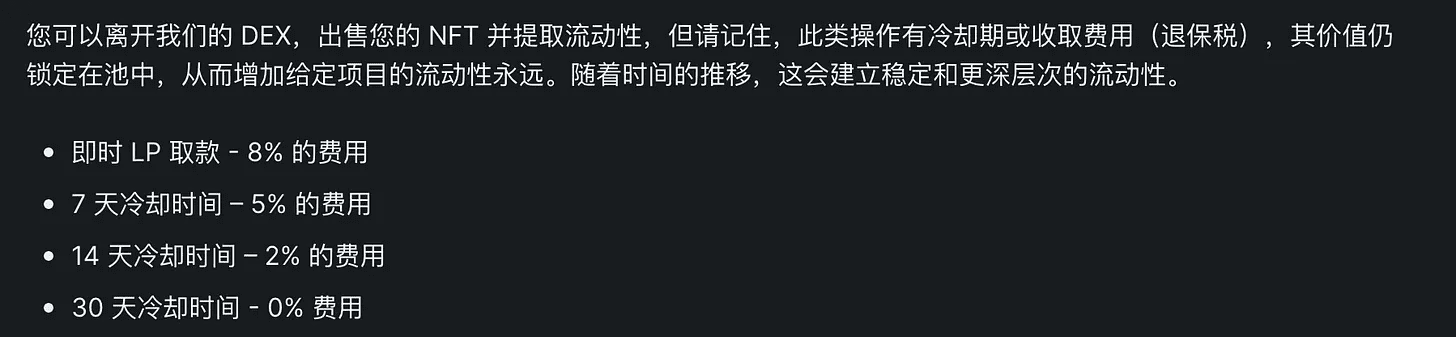 现在Spartadex做的是在DeFi的基础上引入一个游戏层。这个游戏层的NFT,也就是准入门槛。这个门槛不是一个可能归0的NFT,而是一个由LP资产支撑的价值标的(至少不会亏很多,代价是LP有退出门槛,退出手续费会永远留在池子里)。